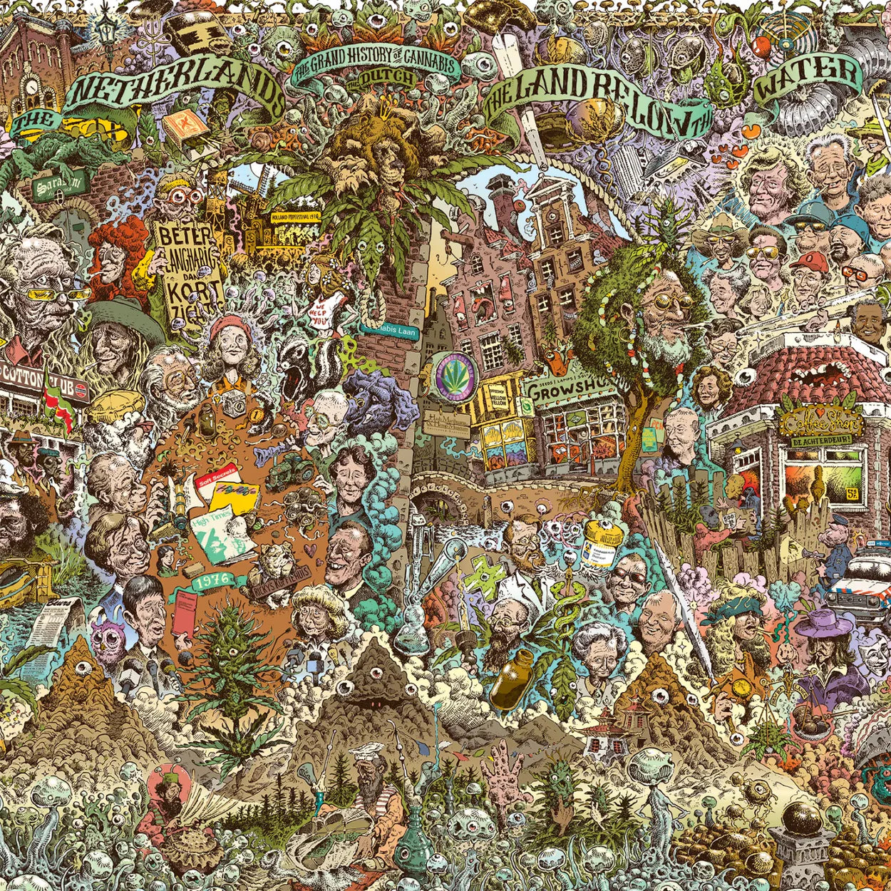 The artwork depicts a short but turbulent time in Netherlands - from about the 50s until the late 2000s the Netherlands were the epi-center of what was cannabis globally during that time. The laws that were created during the very liberal 70s opened the door for many cannabis refugees to come to Holland. Together with the adventurous native Dutch they teamed up to work on their craft and lay the foundation for what is cannabis as we know today. The golden era of Dutch cannabis!
